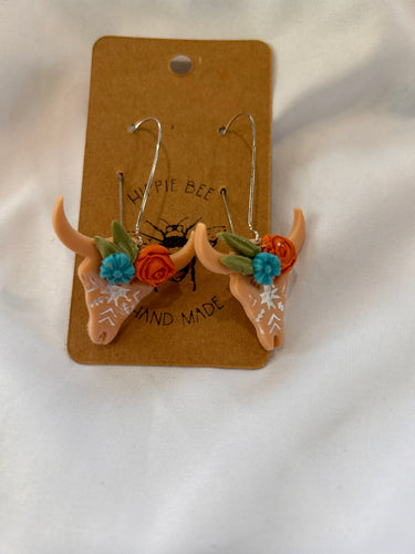 Western floral bull skull polymer dangle earrings